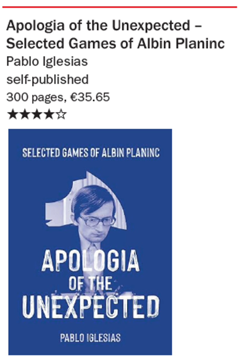 As I always do whenever I want to learn more about any chess topic, I searched around for some books to start with and I found these two. Apologia of the Unexpected – Selected Games of Albin Planinc by Pablo Iglesias (Amazon, self-published, 2020) is just a couple of hundred pages, with 31 lightly-annotated games in very large print format, and in principle it’s not a super book.