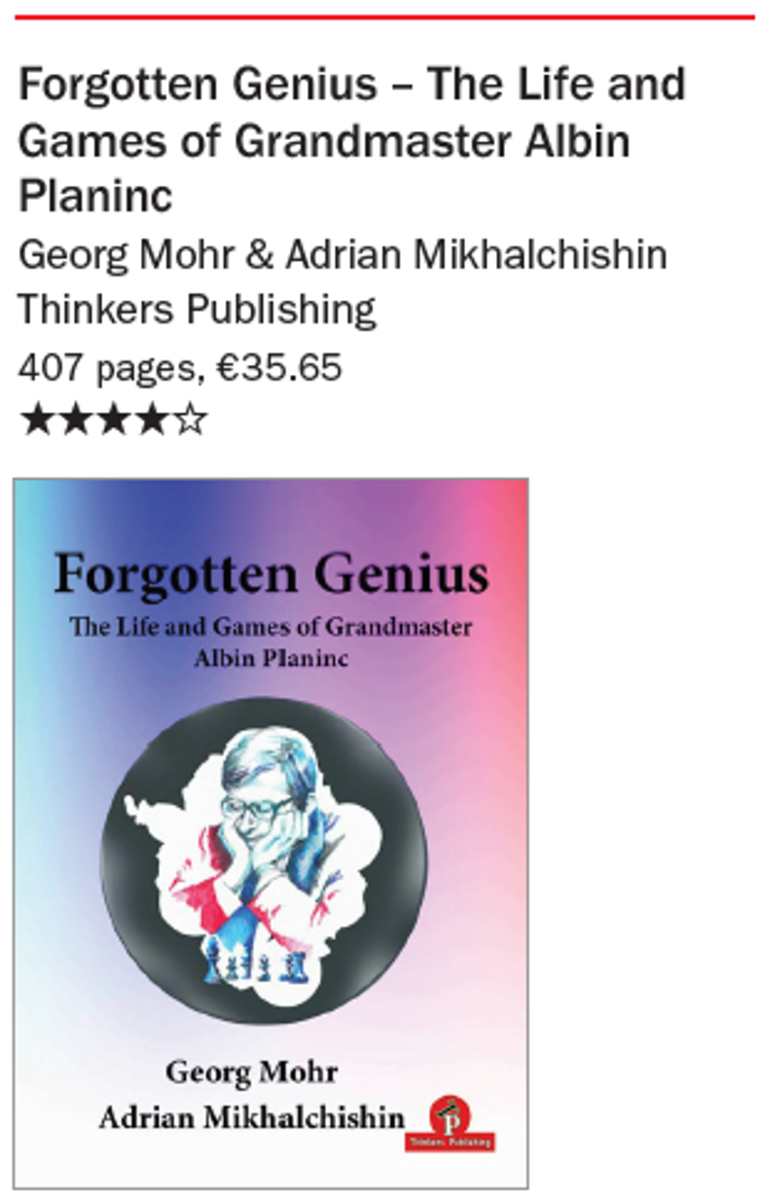 Forgotten Genius – The Life and Games of Grandmaster Albin Planinc is a much weightier work (437 pages), comprised of 85 annotated games and a wealth of biographical detail accompanied by reminiscences and anecdotes from his erstwhile colleagues and I enjoyed it greatly. It’s again one of those stories that leaves you staggered at how someone so lacking in formal chess training and any kind of support could become so strong that he could challenge and even outclass the very best in the world, as he did for example in Amsterdam 1973, sharing first place with Petrosian with 10/15 (7 wins, 2 losses) ahead of Spassky, Kavalek, Szabo, Andersson, Ribli, Donner, Smejkal, Timman and Quinteros.